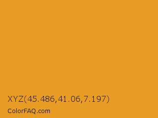 XYZ 45.486,41.06,7.197 Color is a normal orange color and the nearest color is Fire Bush #e89928. Hex code #e89c24 and RGB value is rgb(232,156,36). In RGB color space, this color is composed of 91% red, 61% green, 14% blue, In CMYK color space, this color is composed of 0% cyan, 33% magenta, 84% yellow , 9% black , In HSL color space, this color has a hue angle of 37° , 81% saturation and 53% lightness.