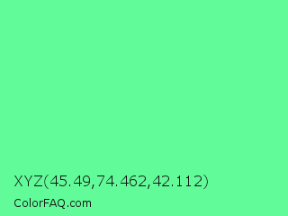 XYZ 45.49,74.462,42.112 Color is a light green color and the nearest color is Very Light Malachite Green #64e986. Hex code #61fc99 and RGB value is rgb(97,252,153). In RGB color space, this color is composed of 38% red, 99% green, 60% blue, In CMYK color space, this color is composed of 62% cyan, 0% magenta, 39% yellow , 1% black , In HSL color space, this color has a hue angle of 142° , 96% saturation and 68% lightness.