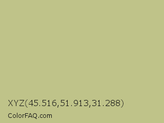 XYZ 45.516,51.913,31.288 Color is a light yellow color and the nearest color is Sage #bcb88a. Hex code #bfc389 and RGB value is rgb(191,195,137). In RGB color space, this color is composed of 75% red, 76% green, 54% blue, In CMYK color space, this color is composed of 2% cyan, 0% magenta, 30% yellow , 24% black , In HSL color space, this color has a hue angle of 64° , 33% saturation and 65% lightness.