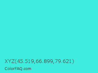 XYZ 45.519,66.899,79.621 Color is a normal cyan color and the nearest color is Turquoise #40e0d0. Hex code #3fedde and RGB value is rgb(63,237,222). In RGB color space, this color is composed of 25% red, 93% green, 87% blue, In CMYK color space, this color is composed of 73% cyan, 0% magenta, 6% yellow , 7% black , In HSL color space, this color has a hue angle of 175° , 83% saturation and 59% lightness.
