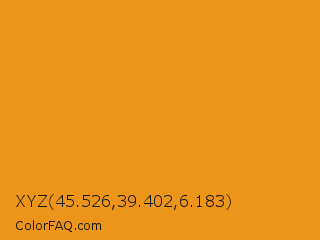 XYZ 45.526,39.402,6.183 Color is a normal orange color and the nearest color is Carrot Orange #ed9121. Hex code #ec951a and RGB value is rgb(236,149,26). In RGB color space, this color is composed of 93% red, 58% green, 10% blue, In CMYK color space, this color is composed of 0% cyan, 37% magenta, 89% yellow , 7% black , In HSL color space, this color has a hue angle of 35° , 85% saturation and 51% lightness.