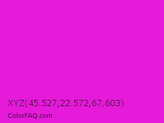 XYZ 45.527,22.572,67.603 Color is a normal magenta color and the nearest color is Hot Magenta #ff1dce. Hex code #e61ad9 and RGB value is rgb(230,26,217). In RGB color space, this color is composed of 90% red, 10% green, 85% blue, In CMYK color space, this color is composed of 0% cyan, 89% magenta, 6% yellow , 10% black , In HSL color space, this color has a hue angle of 304° , 80% saturation and 50% lightness.