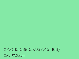 XYZ 45.538,65.937,46.403 Color is a light green color and the nearest color is Teal Deer #99e6b3. Hex code #84e9a6 and RGB value is rgb(132,233,166). In RGB color space, this color is composed of 52% red, 91% green, 65% blue, In CMYK color space, this color is composed of 43% cyan, 0% magenta, 29% yellow , 9% black , In HSL color space, this color has a hue angle of 140° , 70% saturation and 72% lightness.