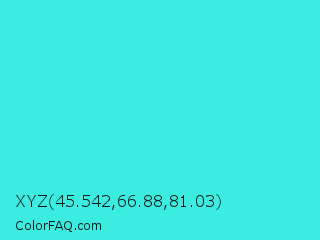 XYZ 45.542,66.88,81.03 Color is a normal cyan color and the nearest color is Turquoise #40e0d0. Hex code #3bede0 and RGB value is rgb(59,237,224). In RGB color space, this color is composed of 23% red, 93% green, 88% blue, In CMYK color space, this color is composed of 75% cyan, 0% magenta, 5% yellow , 7% black , In HSL color space, this color has a hue angle of 176° , 83% saturation and 58% lightness.