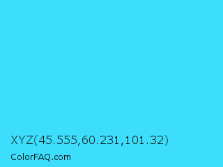 XYZ 45.555,60.231,101.32 Color is a light cyan color and the nearest color is Loeen #15f2fd. Hex code #3cdefc and RGB value is rgb(60,222,252). In RGB color space, this color is composed of 24% red, 87% green, 99% blue, In CMYK color space, this color is composed of 76% cyan, 12% magenta, 0% yellow , 1% black , In HSL color space, this color has a hue angle of 189° , 97% saturation and 61% lightness.