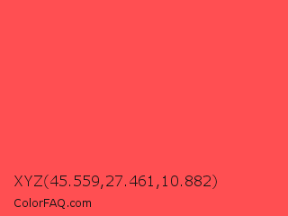 XYZ 45.559,27.461,10.882 Color is a light red color and the nearest color is Red Orange #ff5349. Hex code #ff4f52 and RGB value is rgb(255,79,82). In RGB color space, this color is composed of 100% red, 31% green, 32% blue, In CMYK color space, this color is composed of 0% cyan, 69% magenta, 68% yellow , 0% black , In HSL color space, this color has a hue angle of 359° , 100% saturation and 65% lightness.