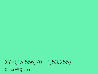 XYZ 45.566,70.14,53.256 Color is a light green color and the nearest color is Medium Aquamarine #66ddaa. Hex code #66f3b2 and RGB value is rgb(102,243,178). In RGB color space, this color is composed of 40% red, 95% green, 70% blue, In CMYK color space, this color is composed of 58% cyan, 0% magenta, 27% yellow , 5% black , In HSL color space, this color has a hue angle of 152° , 85% saturation and 68% lightness.