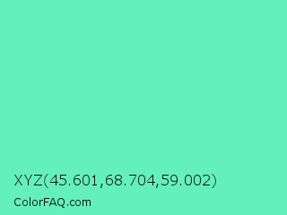 XYZ 45.601,68.704,59.002 Color is a light green color and the nearest color is Medium Aquamarine #66ddaa. Hex code #64f0bd and RGB value is rgb(100,240,189). In RGB color space, this color is composed of 39% red, 94% green, 74% blue, In CMYK color space, this color is composed of 58% cyan, 0% magenta, 21% yellow , 6% black , In HSL color space, this color has a hue angle of 158° , 82% saturation and 67% lightness.