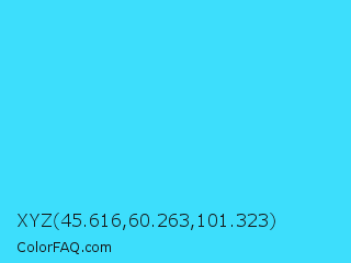 XYZ 45.616,60.263,101.323 Color is a light cyan color and the nearest color is Turquoise #40e0d0. Hex code #3ddefc and RGB value is rgb(61,222,252). In RGB color space, this color is composed of 24% red, 87% green, 99% blue, In CMYK color space, this color is composed of 76% cyan, 12% magenta, 0% yellow , 1% black , In HSL color space, this color has a hue angle of 189° , 97% saturation and 61% lightness.