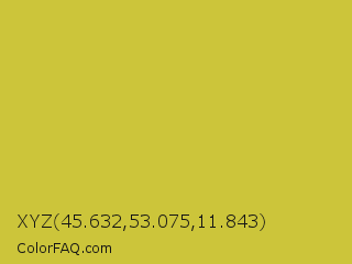 XYZ 45.632,53.075,11.843 Color is a normal yellow color and the nearest color is Earls Green #c9b93b. Hex code #ccc53a and RGB value is rgb(204,197,58). In RGB color space, this color is composed of 80% red, 77% green, 23% blue, In CMYK color space, this color is composed of 0% cyan, 3% magenta, 72% yellow , 20% black , In HSL color space, this color has a hue angle of 57° , 59% saturation and 51% lightness.
