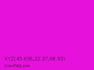 XYZ 45.636,22.37,68.93 Color is a normal magenta color and the nearest color is Hot Magenta #ff1dce. Hex code #e612db and RGB value is rgb(230,18,219). In RGB color space, this color is composed of 90% red, 7% green, 86% blue, In CMYK color space, this color is composed of 0% cyan, 92% magenta, 5% yellow , 10% black , In HSL color space, this color has a hue angle of 303° , 85% saturation and 49% lightness.