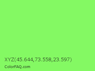 XYZ 45.644,73.558,23.597 Color is a light green color and the nearest color is Screamin Green #66ff66. Hex code #84f963 and RGB value is rgb(132,249,99). In RGB color space, this color is composed of 52% red, 98% green, 39% blue, In CMYK color space, this color is composed of 47% cyan, 0% magenta, 60% yellow , 2% black , In HSL color space, this color has a hue angle of 107° , 93% saturation and 68% lightness.