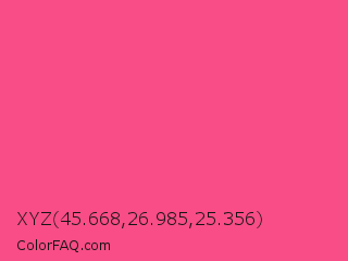 XYZ 45.668,26.985,25.356 Color is a light rose color and the nearest color is French Rose #f64a8a. Hex code #f84d86 and RGB value is rgb(248,77,134). In RGB color space, this color is composed of 97% red, 30% green, 53% blue, In CMYK color space, this color is composed of 0% cyan, 69% magenta, 46% yellow , 3% black , In HSL color space, this color has a hue angle of 340° , 92% saturation and 64% lightness.
