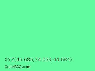 XYZ 45.685,74.039,44.684 Color is a light green color and the nearest color is Very Light Malachite Green #64e986. Hex code #61fb9f and RGB value is rgb(97,251,159). In RGB color space, this color is composed of 38% red, 98% green, 62% blue, In CMYK color space, this color is composed of 61% cyan, 0% magenta, 37% yellow , 2% black , In HSL color space, this color has a hue angle of 144° , 95% saturation and 68% lightness.