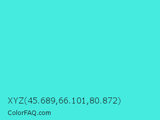 XYZ 45.689,66.101,80.872 Color is a normal cyan color and the nearest color is Turquoise #40e0d0. Hex code #46ebe0 and RGB value is rgb(70,235,224). In RGB color space, this color is composed of 27% red, 92% green, 88% blue, In CMYK color space, this color is composed of 70% cyan, 0% magenta, 5% yellow , 8% black , In HSL color space, this color has a hue angle of 176° , 80% saturation and 60% lightness.