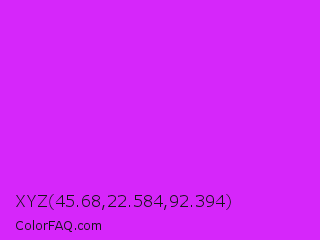 XYZ 45.68,22.584,92.394 Color is a normal purple color and the nearest color is Phlox #df00ff. Hex code #d626fa and RGB value is rgb(214,38,250). In RGB color space, this color is composed of 84% red, 15% green, 98% blue, In CMYK color space, this color is composed of 14% cyan, 85% magenta, 0% yellow , 2% black , In HSL color space, this color has a hue angle of 290° , 95% saturation and 56% lightness.