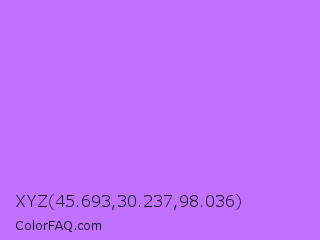 XYZ 45.693,30.237,98.036 Color is a light purple color and the nearest color is Heliotrope #df73ff. Hex code #c071ff and RGB value is rgb(192,113,255). In RGB color space, this color is composed of 75% red, 44% green, 100% blue, In CMYK color space, this color is composed of 25% cyan, 56% magenta, 0% yellow , 0% black , In HSL color space, this color has a hue angle of 273° , 100% saturation and 72% lightness.