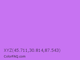 XYZ 45.711,30.814,87.543 Color is a light purple color and the nearest color is Heliotrope #df73ff. Hex code #c773f2 and RGB value is rgb(199,115,242). In RGB color space, this color is composed of 78% red, 45% green, 95% blue, In CMYK color space, this color is composed of 18% cyan, 52% magenta, 0% yellow , 5% black , In HSL color space, this color has a hue angle of 280° , 83% saturation and 70% lightness.