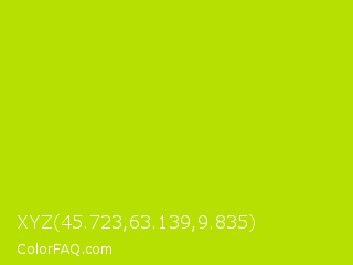 XYZ 45.723,63.139,9.835 Color is a normal lime color and the nearest color is Fuego #bede0d. Hex code #b5e002 and RGB value is rgb(181,224,2). In RGB color space, this color is composed of 71% red, 88% green, 1% blue, In CMYK color space, this color is composed of 19% cyan, 0% magenta, 99% yellow , 12% black , In HSL color space, this color has a hue angle of 72° , 98% saturation and 44% lightness.
