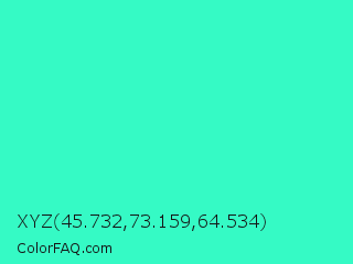 XYZ 45.732,73.159,64.534 Color is a normal cyan color and the nearest color is Turquoise #40e0d0. Hex code #35fac5 and RGB value is rgb(53,250,197). In RGB color space, this color is composed of 21% red, 98% green, 77% blue, In CMYK color space, this color is composed of 79% cyan, 0% magenta, 21% yellow , 2% black , In HSL color space, this color has a hue angle of 164° , 95% saturation and 59% lightness.