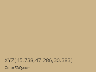 XYZ 45.738,47.286,30.383 Color is a light orange color and the nearest color is Tan #d2b48c. Hex code #ccb489 and RGB value is rgb(204,180,137). In RGB color space, this color is composed of 80% red, 71% green, 54% blue, In CMYK color space, this color is composed of 0% cyan, 12% magenta, 33% yellow , 20% black , In HSL color space, this color has a hue angle of 39° , 40% saturation and 67% lightness.