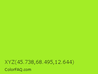 XYZ 45.738,68.495,12.644 Color is a normal green color and the nearest color is Green Lizard #a7f432. Hex code #a3ed26 and RGB value is rgb(163,237,38). In RGB color space, this color is composed of 64% red, 93% green, 15% blue, In CMYK color space, this color is composed of 31% cyan, 0% magenta, 84% yellow , 7% black , In HSL color space, this color has a hue angle of 82° , 85% saturation and 54% lightness.