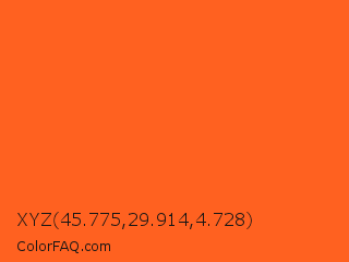 XYZ 45.775,29.914,4.728 Color is a normal orange color and the nearest color is Orange #ff681f. Hex code #ff6120 and RGB value is rgb(255,97,32). In RGB color space, this color is composed of 100% red, 38% green, 13% blue, In CMYK color space, this color is composed of 0% cyan, 62% magenta, 87% yellow , 0% black , In HSL color space, this color has a hue angle of 17° , 100% saturation and 56% lightness.