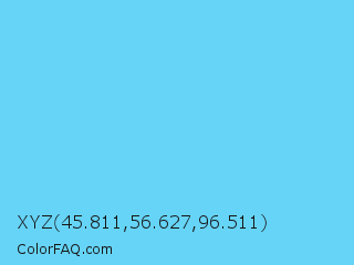 XYZ 45.811,56.627,96.511 Color is a light blue color and the nearest color is Turquoise Blue #6cdae7. Hex code #66d4f7 and RGB value is rgb(102,212,247). In RGB color space, this color is composed of 40% red, 83% green, 97% blue, In CMYK color space, this color is composed of 59% cyan, 14% magenta, 0% yellow , 3% black , In HSL color space, this color has a hue angle of 194° , 90% saturation and 68% lightness.