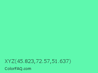 XYZ 45.823,72.57,51.637 Color is a light green color and the nearest color is Medium Aquamarine #66ddaa. Hex code #5ef8ae and RGB value is rgb(94,248,174). In RGB color space, this color is composed of 37% red, 97% green, 68% blue, In CMYK color space, this color is composed of 62% cyan, 0% magenta, 30% yellow , 3% black , In HSL color space, this color has a hue angle of 151° , 92% saturation and 67% lightness.