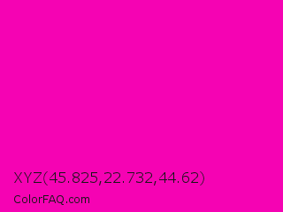 XYZ 45.825,22.732,44.62 Color is a normal magenta color and the nearest color is Hollywood Cerise #f400a1. Hex code #f503b3 and RGB value is rgb(245,3,179). In RGB color space, this color is composed of 96% red, 1% green, 70% blue, In CMYK color space, this color is composed of 0% cyan, 99% magenta, 27% yellow , 4% black , In HSL color space, this color has a hue angle of 316° , 98% saturation and 49% lightness.