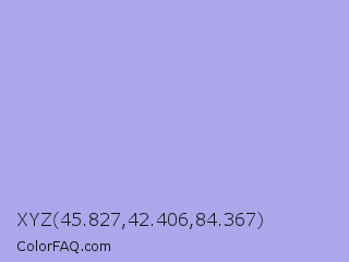 XYZ 45.827,42.406,84.367 Color is a light indigo color and the nearest color is Maximum Blue Purple #acace6. Hex code #aca7eb and RGB value is rgb(172,167,235). In RGB color space, this color is composed of 67% red, 65% green, 92% blue, In CMYK color space, this color is composed of 27% cyan, 29% magenta, 0% yellow , 8% black , In HSL color space, this color has a hue angle of 244° , 63% saturation and 79% lightness.