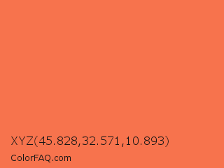 XYZ 45.828,32.571,10.893 Color is a light red color and the nearest color is Mandarin #f37a48. Hex code #f7734d and RGB value is rgb(247,115,77). In RGB color space, this color is composed of 97% red, 45% green, 30% blue, In CMYK color space, this color is composed of 0% cyan, 53% magenta, 69% yellow , 3% black , In HSL color space, this color has a hue angle of 13° , 91% saturation and 64% lightness.