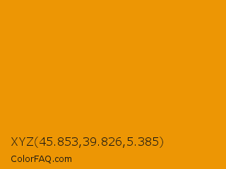 XYZ 45.853,39.826,5.385 Color is a normal orange color and the nearest color is Orange RYB #fb9902. Hex code #ed9604 and RGB value is rgb(237,150,4). In RGB color space, this color is composed of 93% red, 59% green, 2% blue, In CMYK color space, this color is composed of 0% cyan, 37% magenta, 98% yellow , 7% black , In HSL color space, this color has a hue angle of 38° , 97% saturation and 47% lightness.