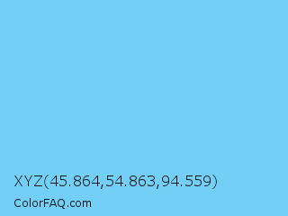 XYZ 45.864,54.863,94.559 Color is a light blue color and the nearest color is Malibu #7dc8f7. Hex code #73cff5 and RGB value is rgb(115,207,245). In RGB color space, this color is composed of 45% red, 81% green, 96% blue, In CMYK color space, this color is composed of 53% cyan, 16% magenta, 0% yellow , 4% black , In HSL color space, this color has a hue angle of 198° , 87% saturation and 71% lightness.