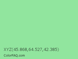 XYZ 45.868,64.527,42.385 Color is a light green color and the nearest color is Light Green #90ee90. Hex code #91e59e and RGB value is rgb(145,229,158). In RGB color space, this color is composed of 57% red, 90% green, 62% blue, In CMYK color space, this color is composed of 37% cyan, 0% magenta, 31% yellow , 10% black , In HSL color space, this color has a hue angle of 129° , 62% saturation and 73% lightness.