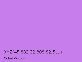 XYZ 45.882,32.808,82.511 Color is a light purple color and the nearest color is Lavender #b57edc. Hex code #c77deb and RGB value is rgb(199,125,235). In RGB color space, this color is composed of 78% red, 49% green, 92% blue, In CMYK color space, this color is composed of 15% cyan, 47% magenta, 0% yellow , 8% black , In HSL color space, this color has a hue angle of 280° , 73% saturation and 71% lightness.