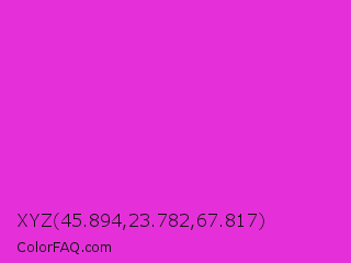 XYZ 45.894,23.782,67.817 Color is a normal magenta color and the nearest color is Steel Pink #cc33cc. Hex code #e530d9 and RGB value is rgb(229,48,217). In RGB color space, this color is composed of 90% red, 19% green, 85% blue, In CMYK color space, this color is composed of 0% cyan, 79% magenta, 5% yellow , 10% black , In HSL color space, this color has a hue angle of 304° , 78% saturation and 54% lightness.
