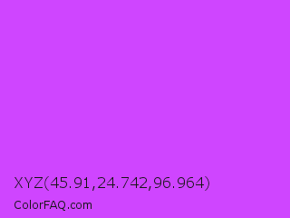 XYZ 45.91,24.742,96.964 Color is a light purple color and the nearest color is Heliotrope #df73ff. Hex code #cf45ff and RGB value is rgb(207,69,255). In RGB color space, this color is composed of 81% red, 27% green, 100% blue, In CMYK color space, this color is composed of 19% cyan, 73% magenta, 0% yellow , 0% black , In HSL color space, this color has a hue angle of 285° , 100% saturation and 64% lightness.