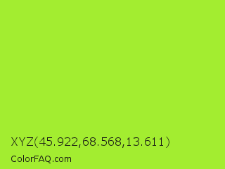 XYZ 45.922,68.568,13.611 Color is a normal green color and the nearest color is Green Lizard #a7f432. Hex code #a3ed30 and RGB value is rgb(163,237,48). In RGB color space, this color is composed of 64% red, 93% green, 19% blue, In CMYK color space, this color is composed of 31% cyan, 0% magenta, 80% yellow , 7% black , In HSL color space, this color has a hue angle of 83° , 84% saturation and 56% lightness.