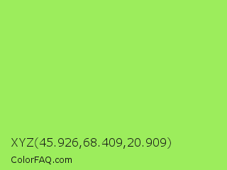 XYZ 45.926,68.409,20.909 Color is a light green color and the nearest color is Inchworm #b2ec5d. Hex code #9ced5c and RGB value is rgb(156,237,92). In RGB color space, this color is composed of 61% red, 93% green, 36% blue, In CMYK color space, this color is composed of 34% cyan, 0% magenta, 61% yellow , 7% black , In HSL color space, this color has a hue angle of 94° , 80% saturation and 65% lightness.