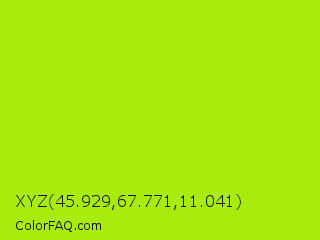 XYZ 45.929,67.771,11.041 Color is a normal lime color and the nearest color is Inch Worm #b0e313. Hex code #a8eb0d and RGB value is rgb(168,235,13). In RGB color space, this color is composed of 66% red, 92% green, 5% blue, In CMYK color space, this color is composed of 29% cyan, 0% magenta, 94% yellow , 8% black , In HSL color space, this color has a hue angle of 78° , 90% saturation and 49% lightness.