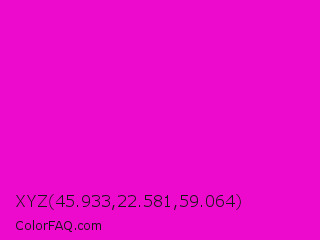 XYZ 45.933,22.581,59.064 Color is a normal magenta color and the nearest color is Shocking Pink #fc0fc0. Hex code #ed0acc and RGB value is rgb(237,10,204). In RGB color space, this color is composed of 93% red, 4% green, 80% blue, In CMYK color space, this color is composed of 0% cyan, 96% magenta, 14% yellow , 7% black , In HSL color space, this color has a hue angle of 309° , 92% saturation and 48% lightness.