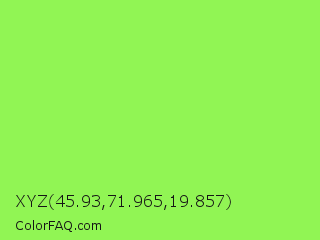 XYZ 45.93,71.965,19.857 Color is a light green color and the nearest color is Kiwi #8ee53f. Hex code #91f554 and RGB value is rgb(145,245,84). In RGB color space, this color is composed of 57% red, 96% green, 33% blue, In CMYK color space, this color is composed of 41% cyan, 0% magenta, 66% yellow , 4% black , In HSL color space, this color has a hue angle of 97° , 89% saturation and 65% lightness.