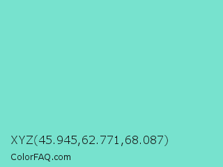 XYZ 45.945,62.771,68.087 Color is a light cyan color and the nearest color is Bermuda #7dd8c6. Hex code #77e2ce and RGB value is rgb(119,226,206). In RGB color space, this color is composed of 47% red, 89% green, 81% blue, In CMYK color space, this color is composed of 47% cyan, 0% magenta, 9% yellow , 11% black , In HSL color space, this color has a hue angle of 169° , 65% saturation and 68% lightness.