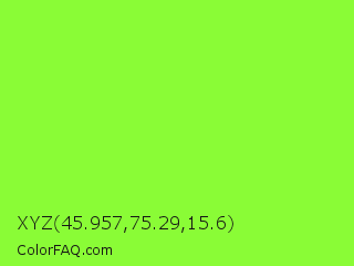 XYZ 45.957,75.29,15.6 Color is a normal green color and the nearest color is Spring Frost #87ff2a. Hex code #8afc36 and RGB value is rgb(138,252,54). In RGB color space, this color is composed of 54% red, 99% green, 21% blue, In CMYK color space, this color is composed of 45% cyan, 0% magenta, 79% yellow , 1% black , In HSL color space, this color has a hue angle of 95° , 97% saturation and 60% lightness.