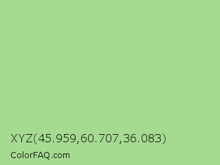 XYZ 45.959,60.707,36.083 Color is a light green color and the nearest color is Feijoa #9fdd8c. Hex code #a5db91 and RGB value is rgb(165,219,145). In RGB color space, this color is composed of 65% red, 86% green, 57% blue, In CMYK color space, this color is composed of 25% cyan, 0% magenta, 34% yellow , 14% black , In HSL color space, this color has a hue angle of 104° , 51% saturation and 71% lightness.