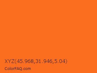 XYZ 45.968,31.946,5.04 Color is a normal orange color and the nearest color is Orange #ff681f. Hex code #fc6e1f and RGB value is rgb(252,110,31). In RGB color space, this color is composed of 99% red, 43% green, 12% blue, In CMYK color space, this color is composed of 0% cyan, 56% magenta, 88% yellow , 1% black , In HSL color space, this color has a hue angle of 21° , 97% saturation and 55% lightness.
