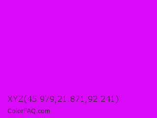 XYZ 45.979,21.871,92.241 Color is a normal magenta color and the nearest color is Phlox #df00ff. Hex code #d90afa and RGB value is rgb(217,10,250). In RGB color space, this color is composed of 85% red, 4% green, 98% blue, In CMYK color space, this color is composed of 13% cyan, 96% magenta, 0% yellow , 2% black , In HSL color space, this color has a hue angle of 292° , 96% saturation and 51% lightness.