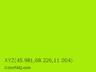 XYZ 45.981,68.226,11.004 Color is a normal lime color and the nearest color is Inch Worm #b0e313. Hex code #a7ec09 and RGB value is rgb(167,236,9). In RGB color space, this color is composed of 65% red, 93% green, 4% blue, In CMYK color space, this color is composed of 29% cyan, 0% magenta, 96% yellow , 7% black , In HSL color space, this color has a hue angle of 78° , 93% saturation and 48% lightness.
