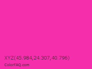XYZ 45.984,24.307,40.796 Color is a normal magenta color and the nearest color is Persian Rose #fe28a2. Hex code #f52eab and RGB value is rgb(245,46,171). In RGB color space, this color is composed of 96% red, 18% green, 67% blue, In CMYK color space, this color is composed of 0% cyan, 81% magenta, 30% yellow , 4% black , In HSL color space, this color has a hue angle of 322° , 91% saturation and 57% lightness.
